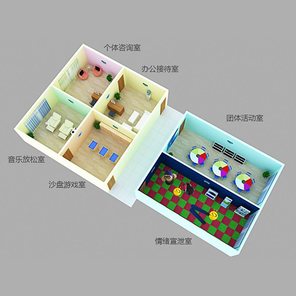 接待測評室、個體咨詢室、心理沙盤室、音樂放松室